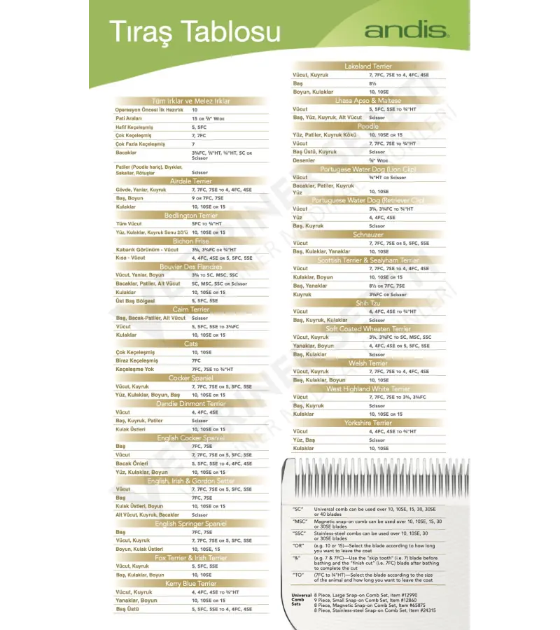 Andis, belirli bir cins ya da kendi köpeğiniz için hangi bıçağa ihtiyacınız olduğunu bilmiyorsanız bu kılavuzu oluşturdu. Lütfen kesim uzunluklarının tüyün doğal yatışına karşı olduğunu unutmayın. Tüyün yatış yönünde kesmek, tüyü bir beden daha uzun bırakır (örneğin #7 bıçakla yatış yönünde kesmek = #5 uzunluğunda olur). Tüm önerilen bıçaklar, tüyün yatış yönünde kullanılmalıdır.